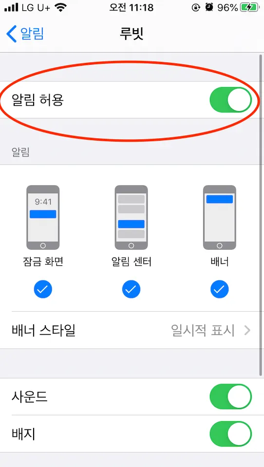 해당 앱에 대한 알림 설정이 ON인지 꼭 확인해주세요!
