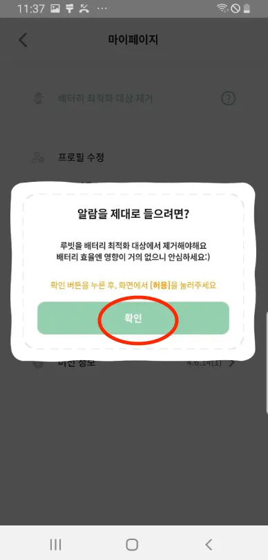 루빗 앱 > 설정탭 > 상단 MY > “배터리 최적화 대상 제거" 클릭
