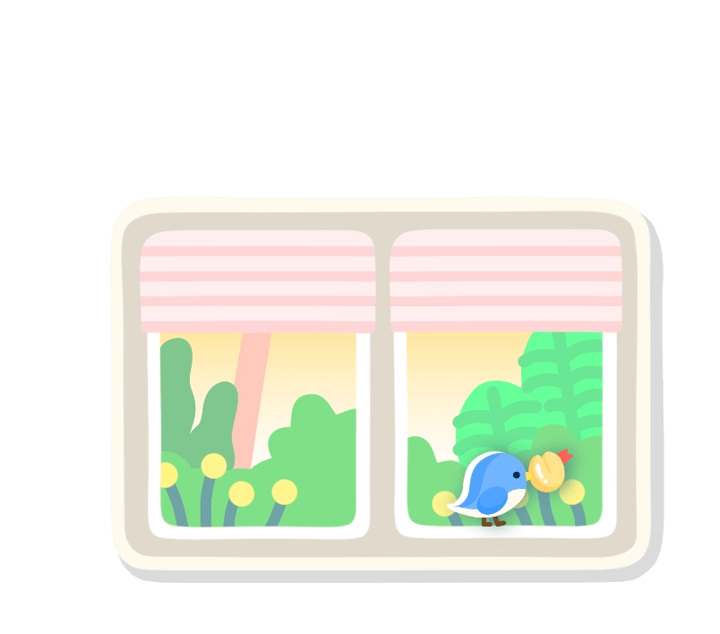 창문 너머로 싱그러운 초록 숲이 보여요. 노란 꽃들이 바람에 살랑이는 모습을 보니 소풍을 떠나고 싶어요.