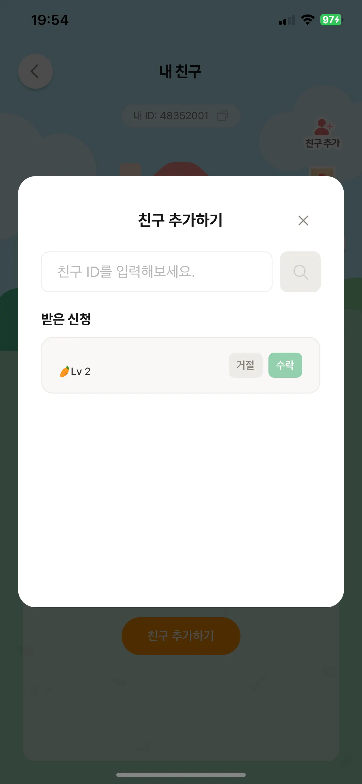 친구 계정에서 내 ID로 친구 신청을 했다면, 내 화면에서 “친구 추가하기” 버튼을 눌러 신청 내역을 확인할 수 있어요