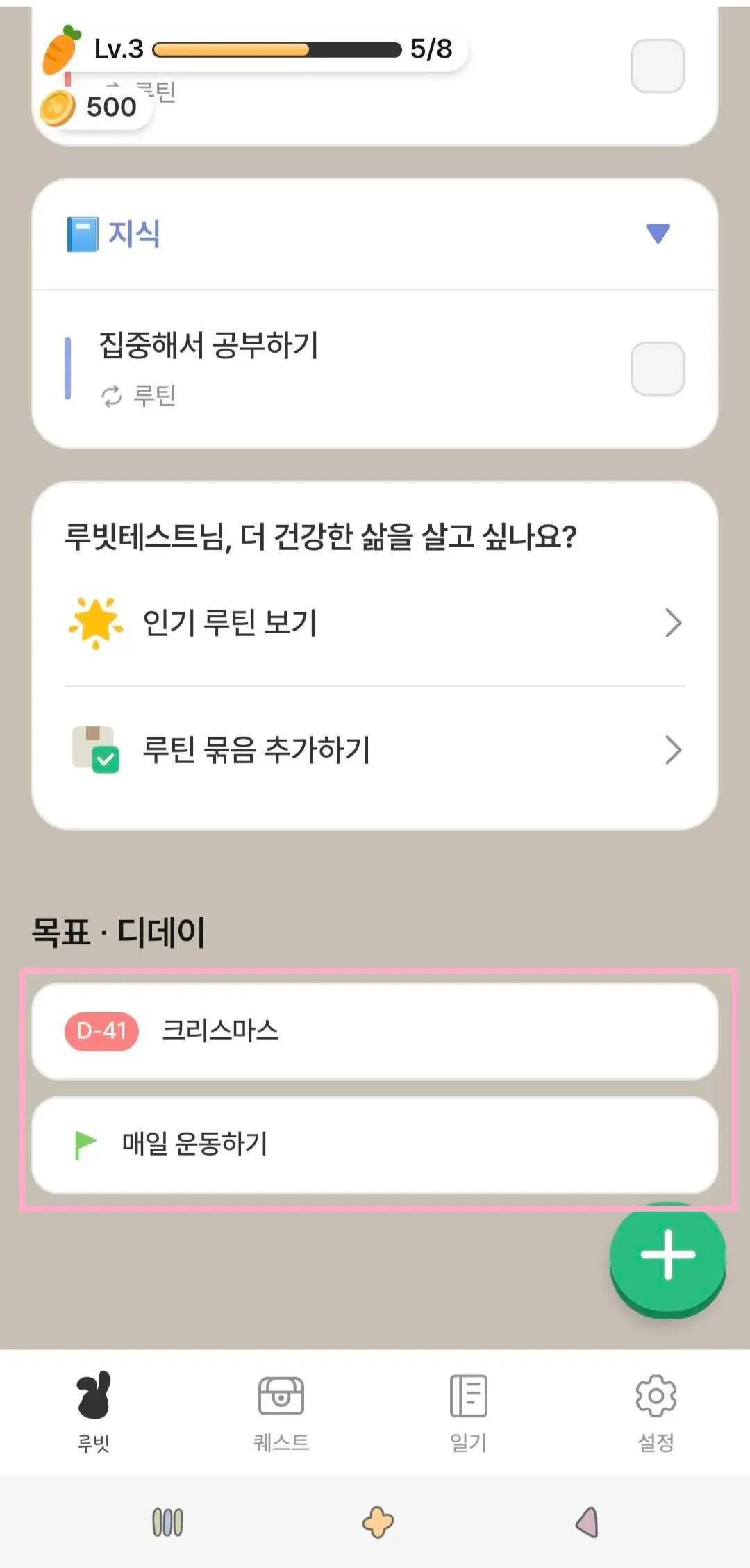 목표와 디데이 기능은 루빗 탭 아래에서 볼 수 있어요!