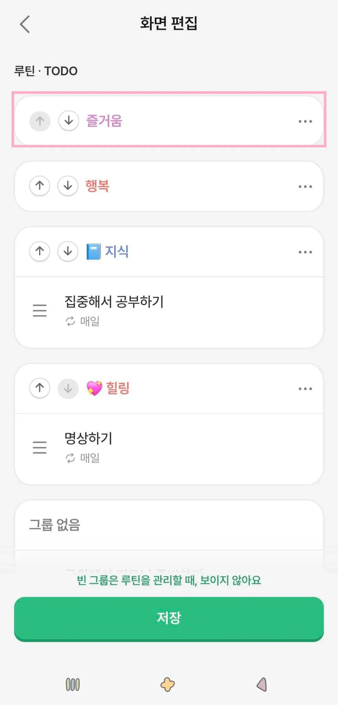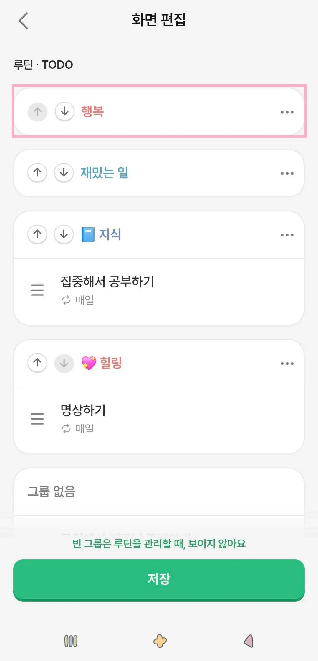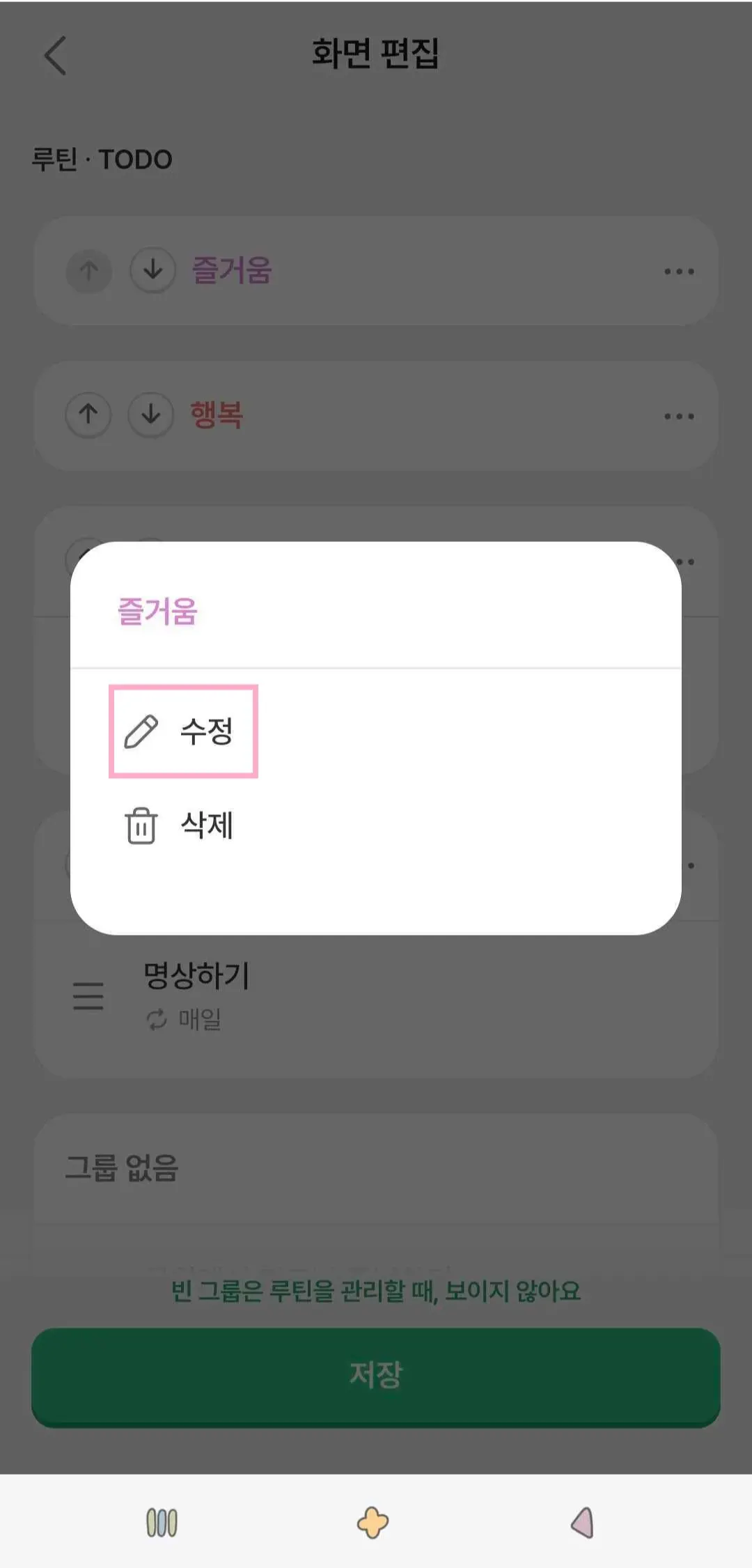 루빗 탭 → ‘화면 편집’ 메뉴에서 그룹을 선택하여 수정하거나 삭제할 수 있어요!