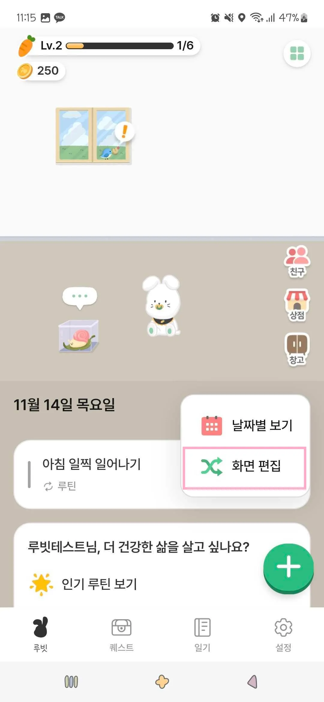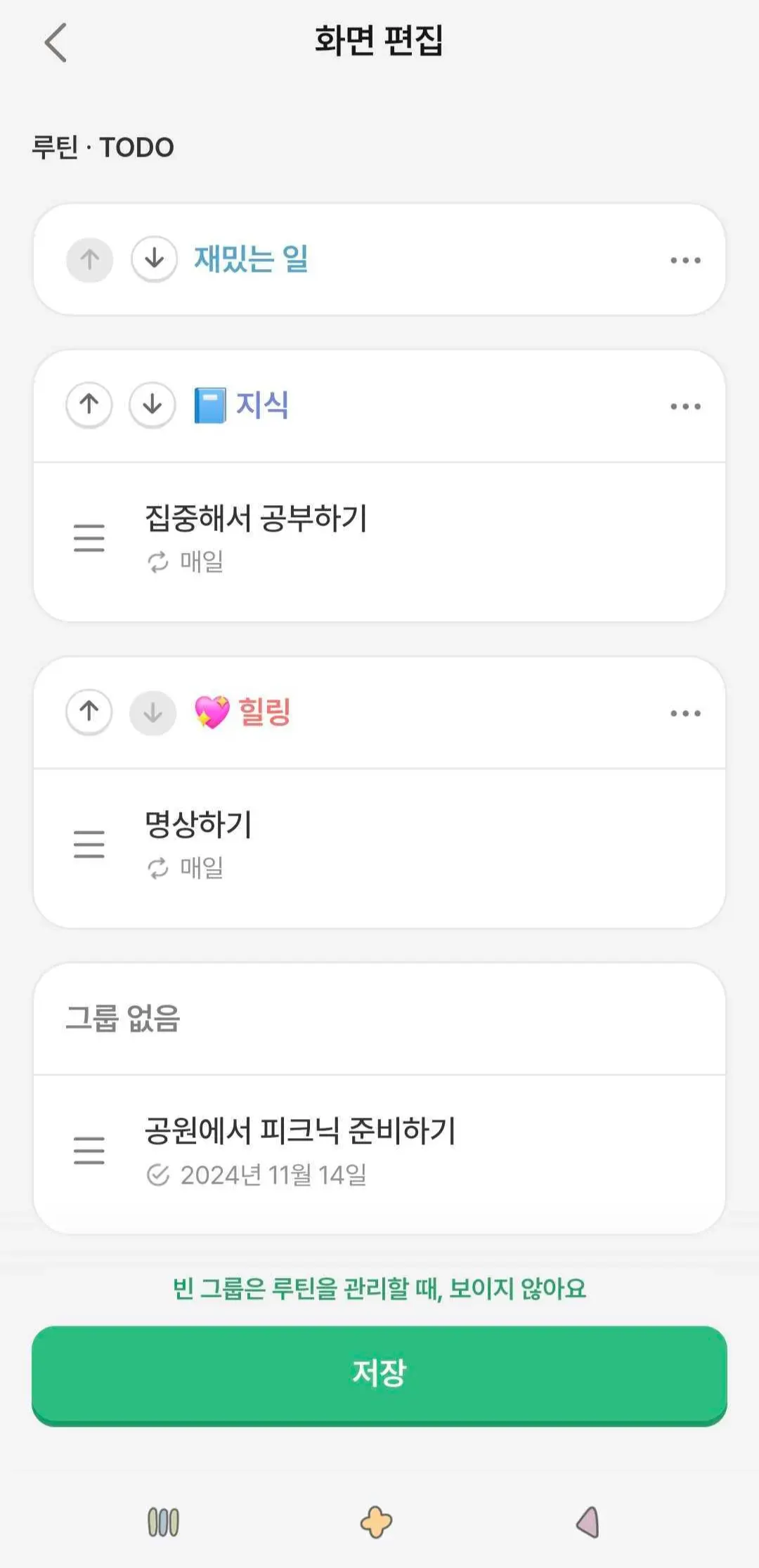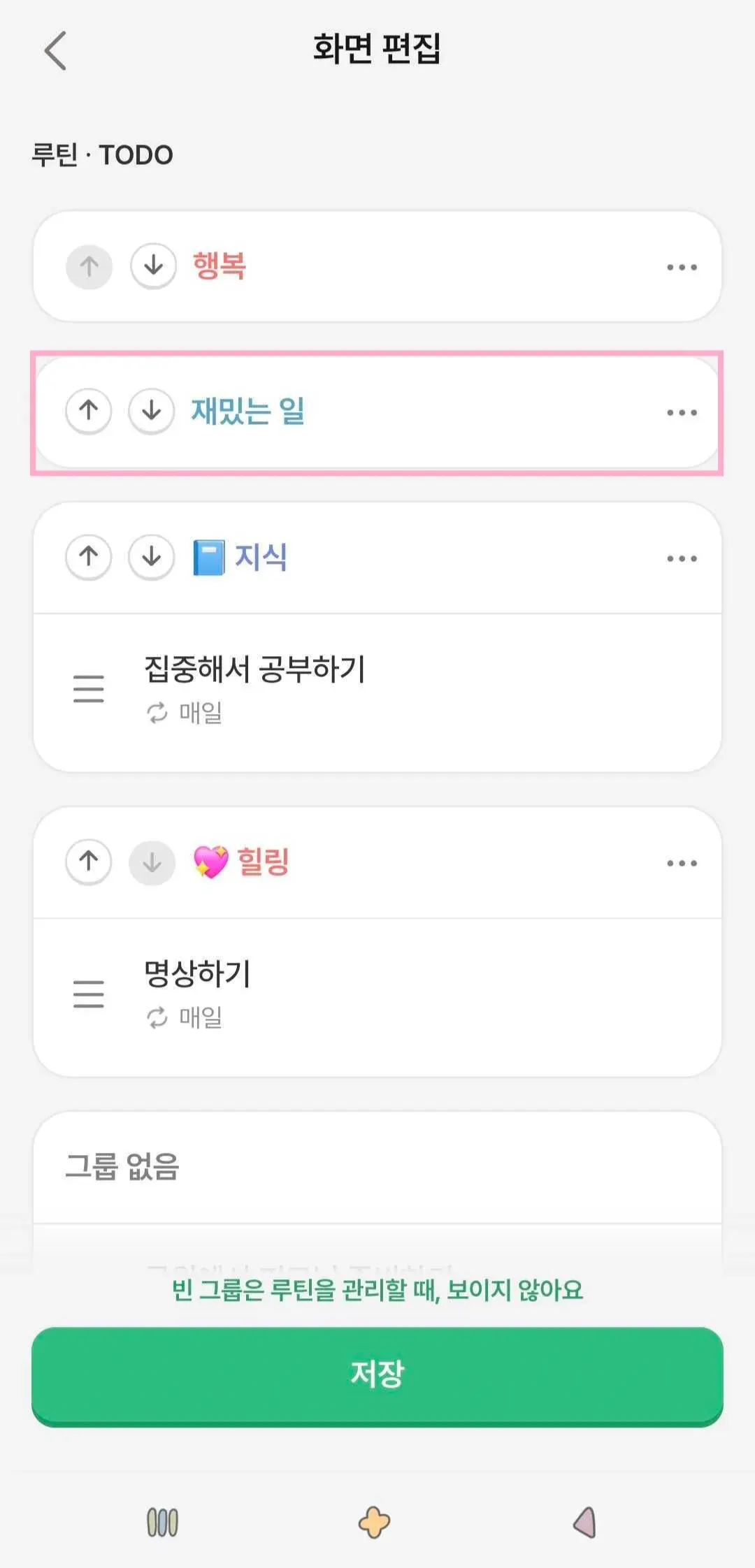 루빗 탭 → ‘화면 편집’ 메뉴에서 그룹을 선택하여 수정하거나 삭제할 수 있어요!