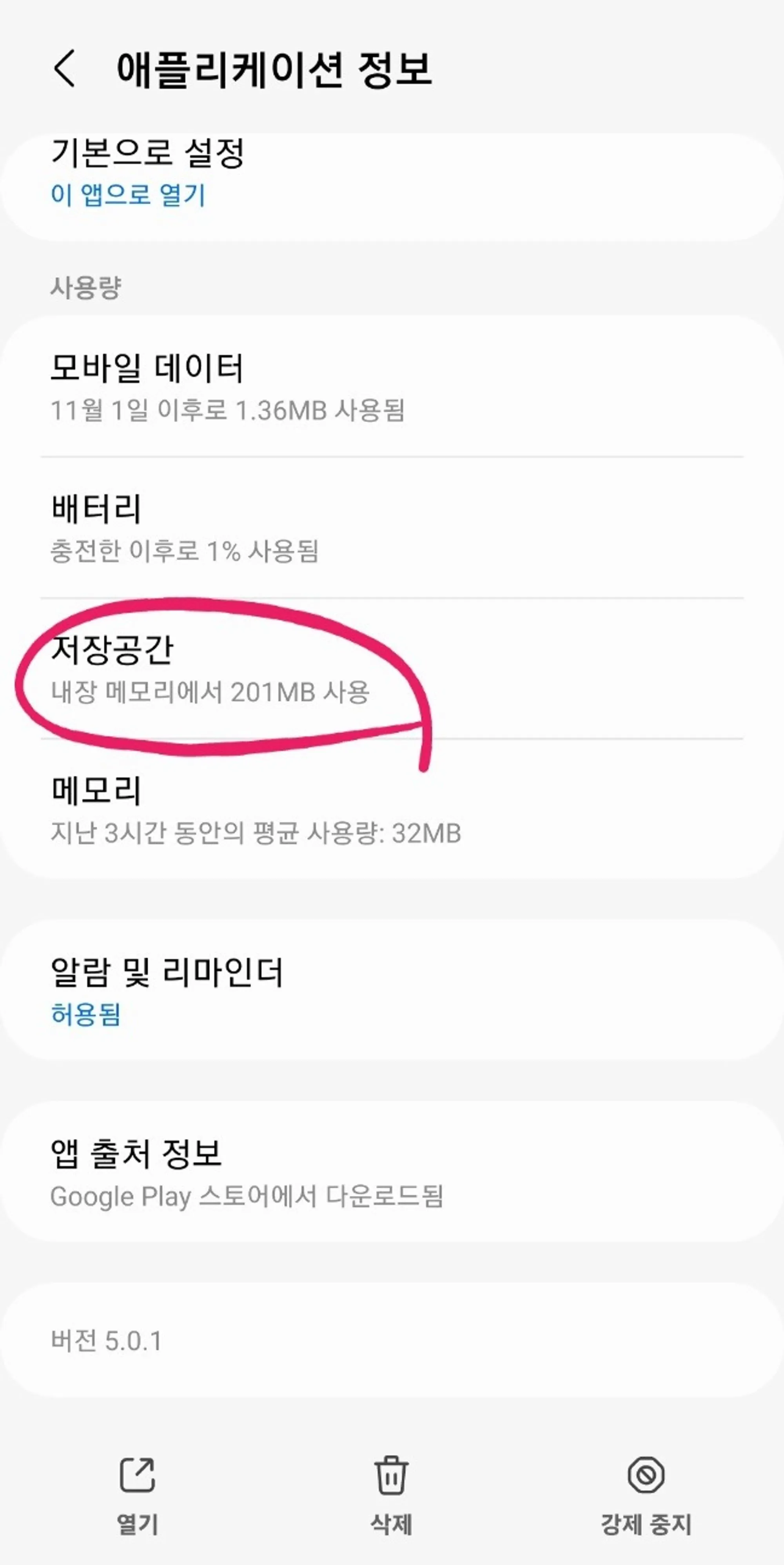 저장 공간을 누르고 “데이터 삭제”, “캐시 삭제”를 눌러 주세요