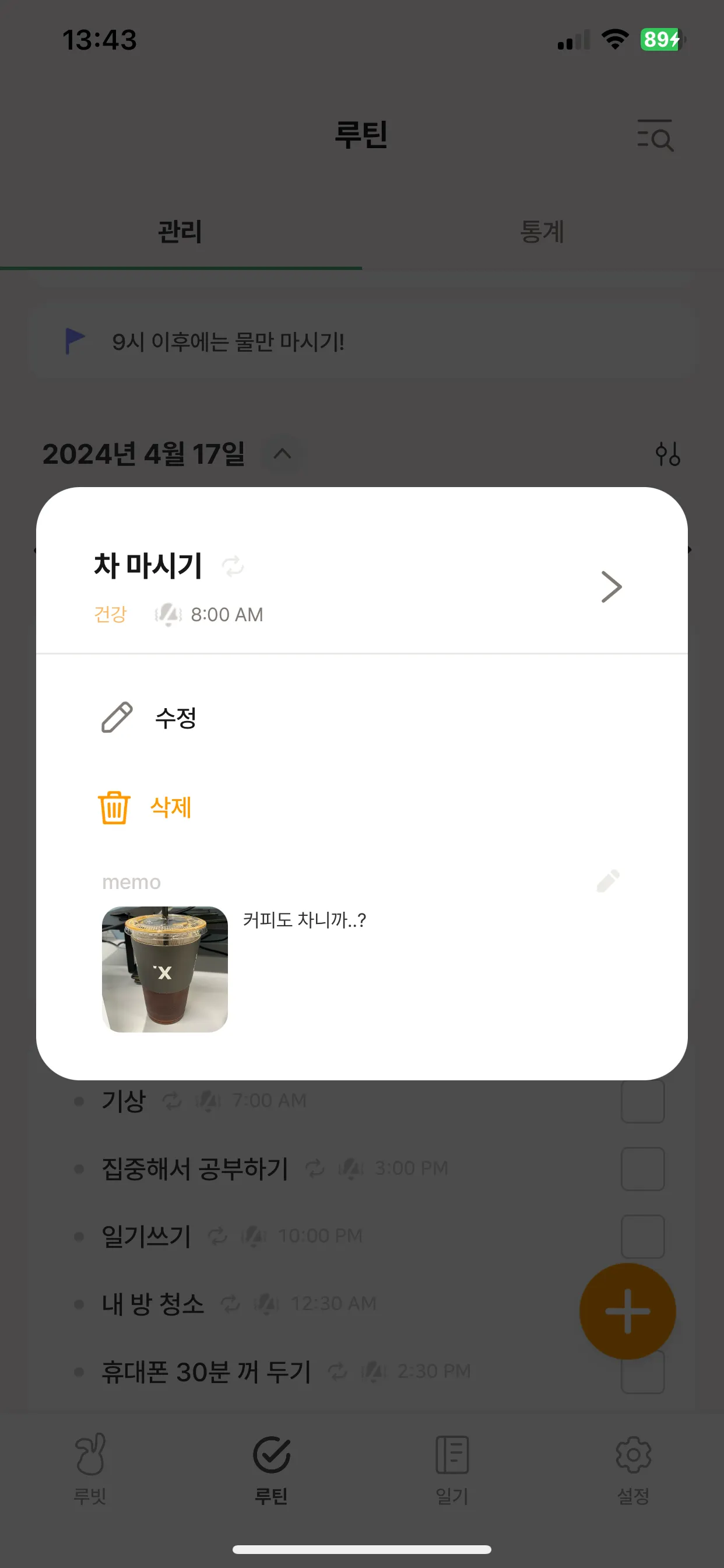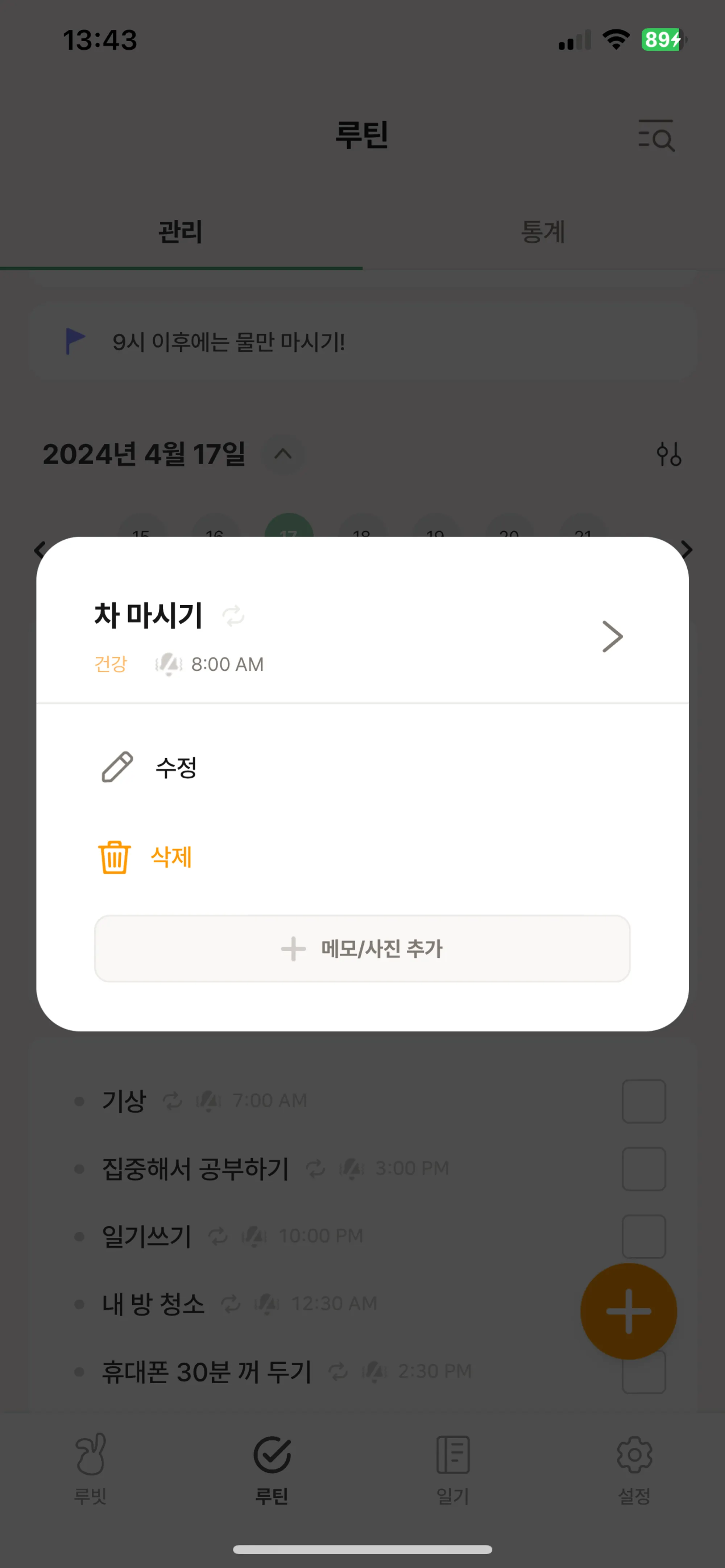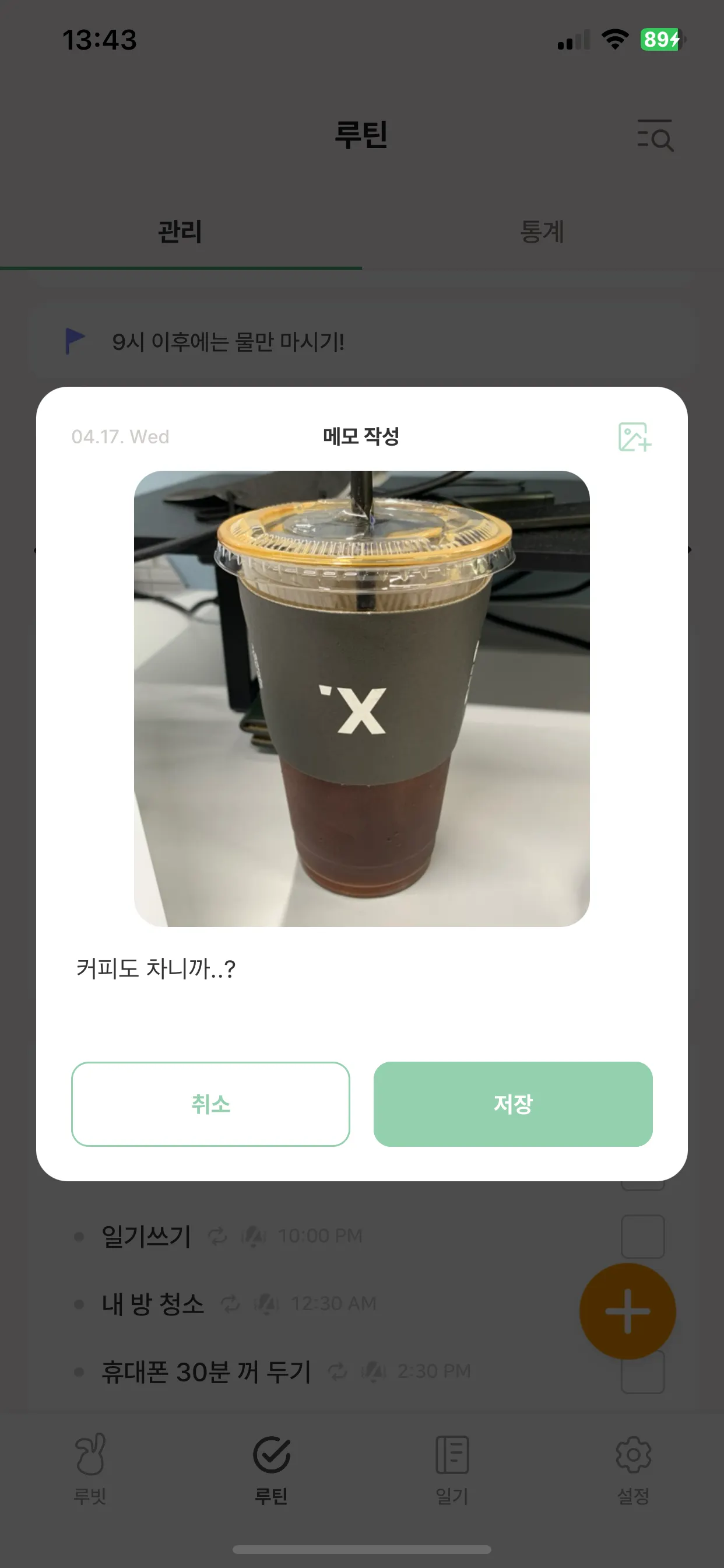 루틴 선택 후 ‘메모’에서 사진과 간단한 문장을 작성할 수 있어요!