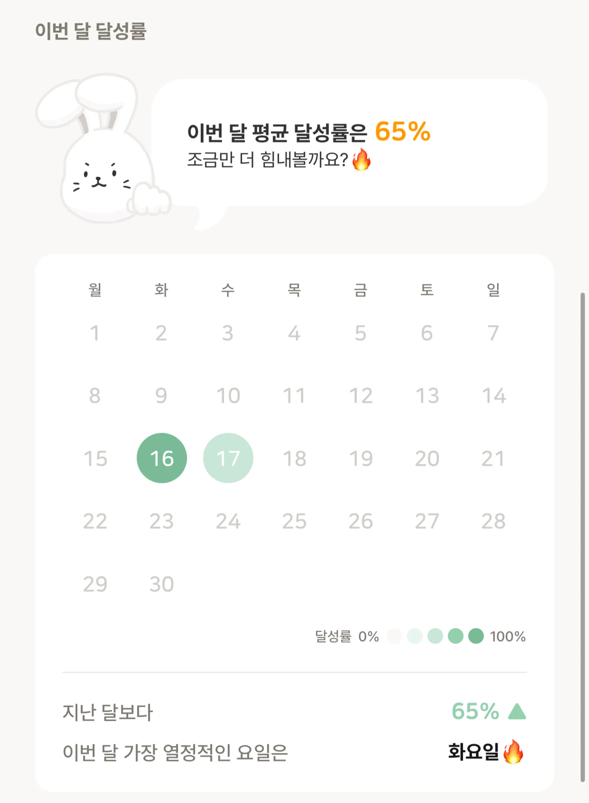 이번 달 전체 루틴 중 완료한 루틴의 비중을 %로 확인할 수 있어요