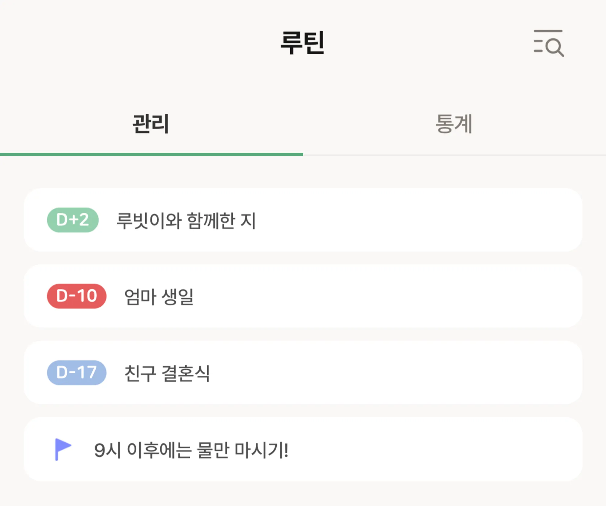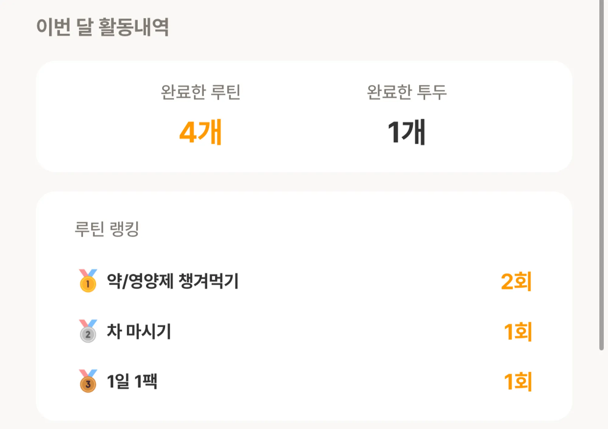 내가 완료한 루틴 / TODO 개수와 가장 많이 완료한 루틴을 확인할 수 있어요