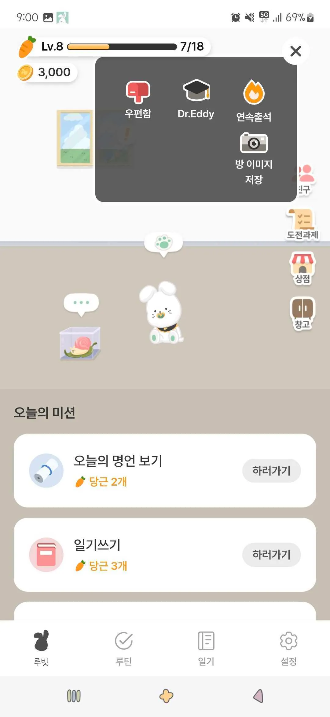 루빗 캐릭터를 클릭하고 발바닥 아이콘을 눌러야 출석 체크를 할 수 있었어요.