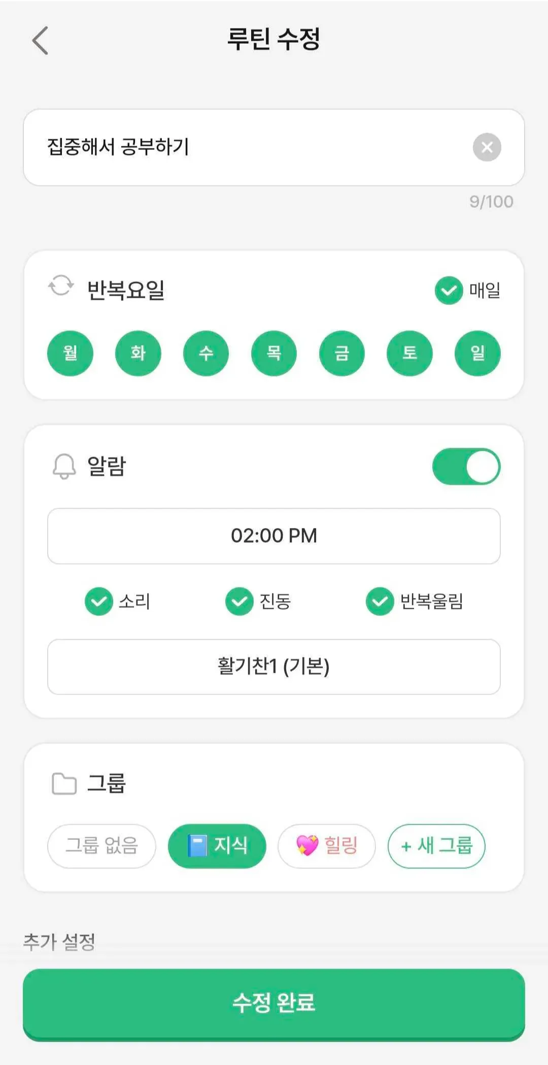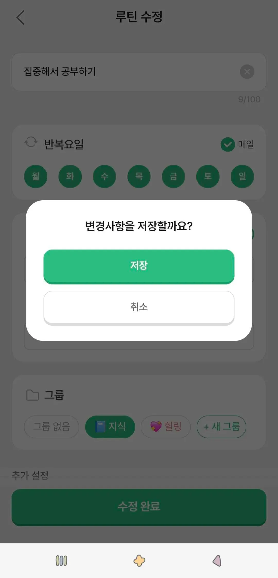 루틴 수정 화면에서 바꾸고 싶은 내용을 수정 후 수정완료를 눌러주세요