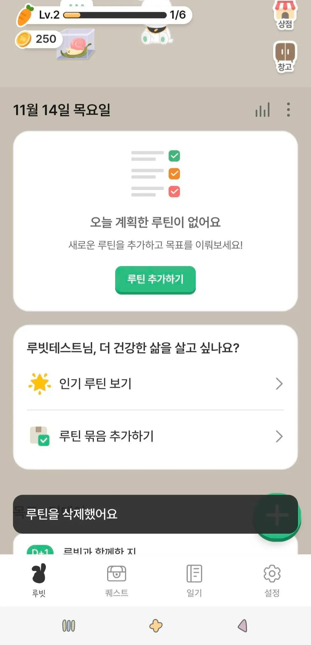 ‘루빗’탭에서 삭제하고 싶은 루틴을 1초 정도 눌러 주세요
