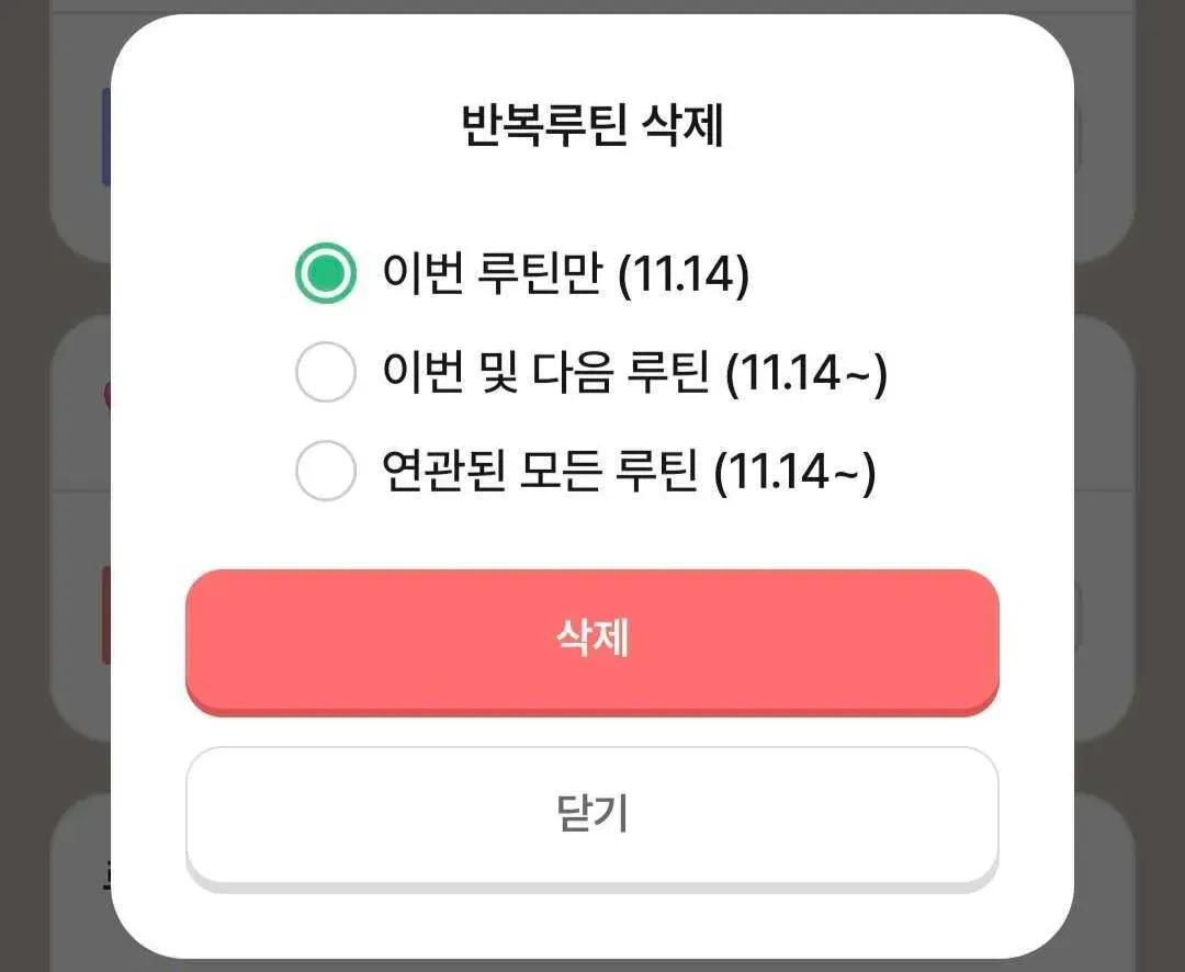 이번 루틴만 : 선택한 날짜의 루틴만 삭제됩니다.