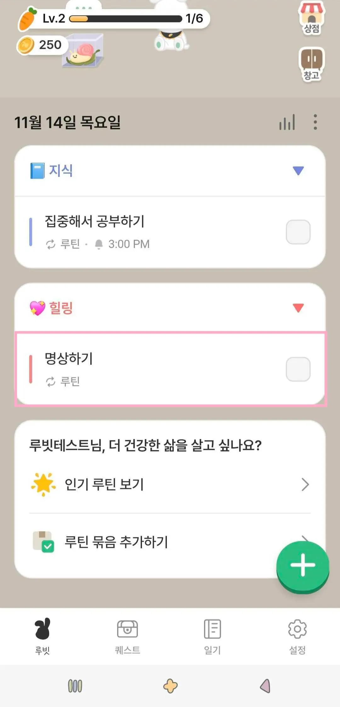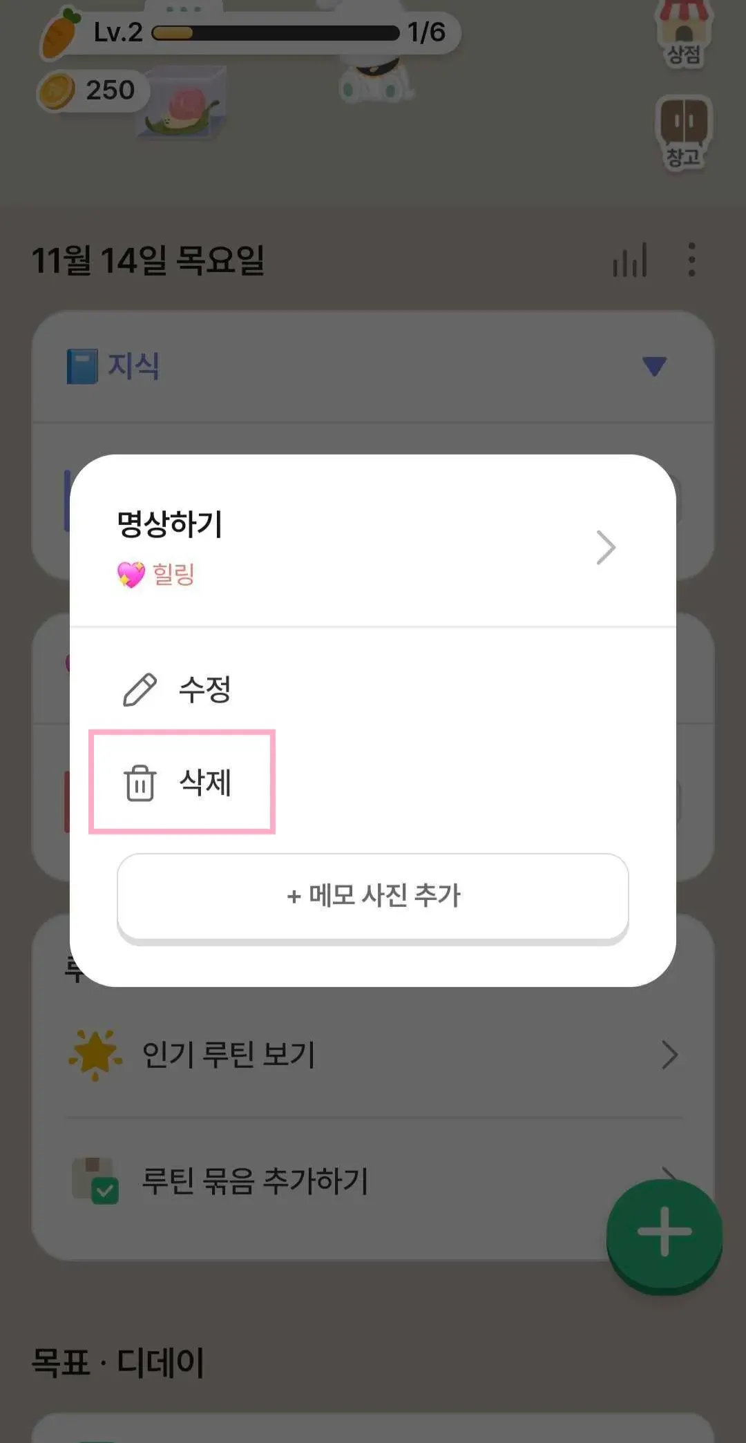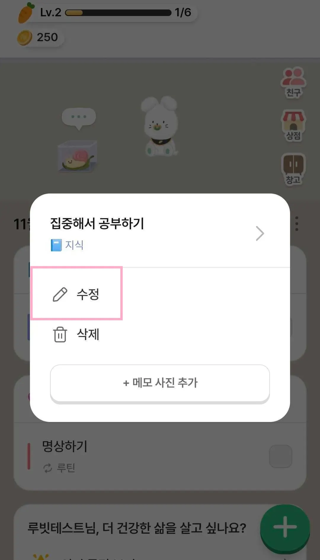 ‘루빗’ 탭에서 루틴을 꾹 눌러 ‘수정’이나 ‘삭제’를 누르면 되어요!