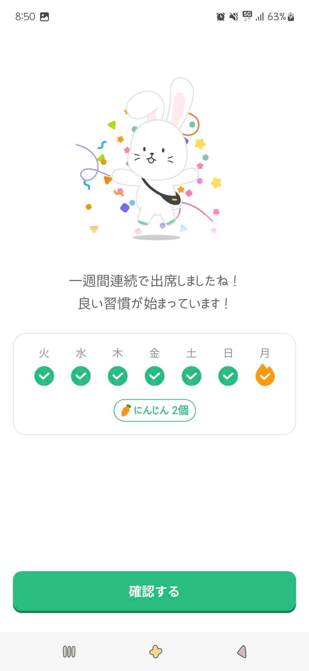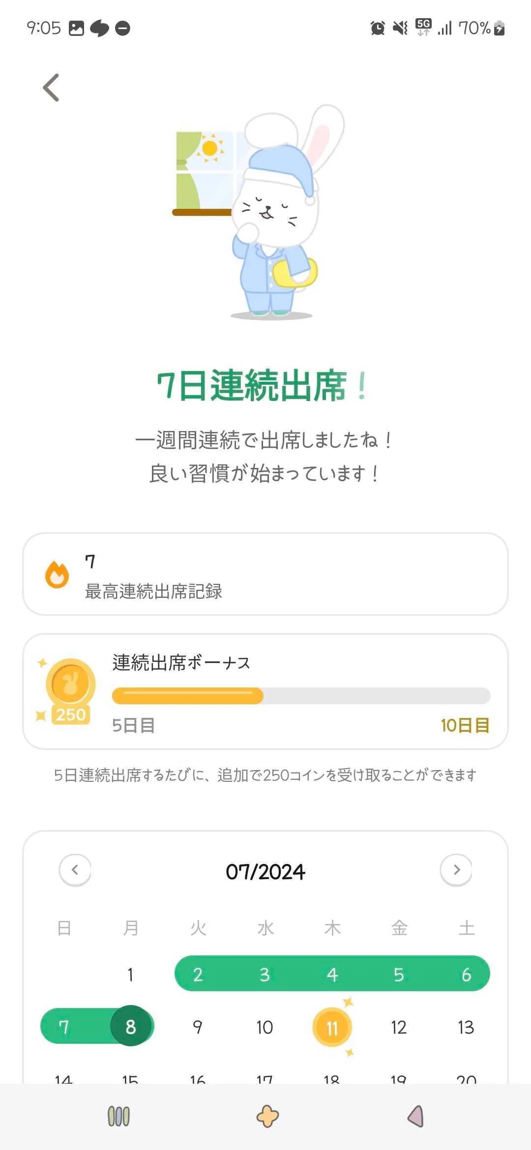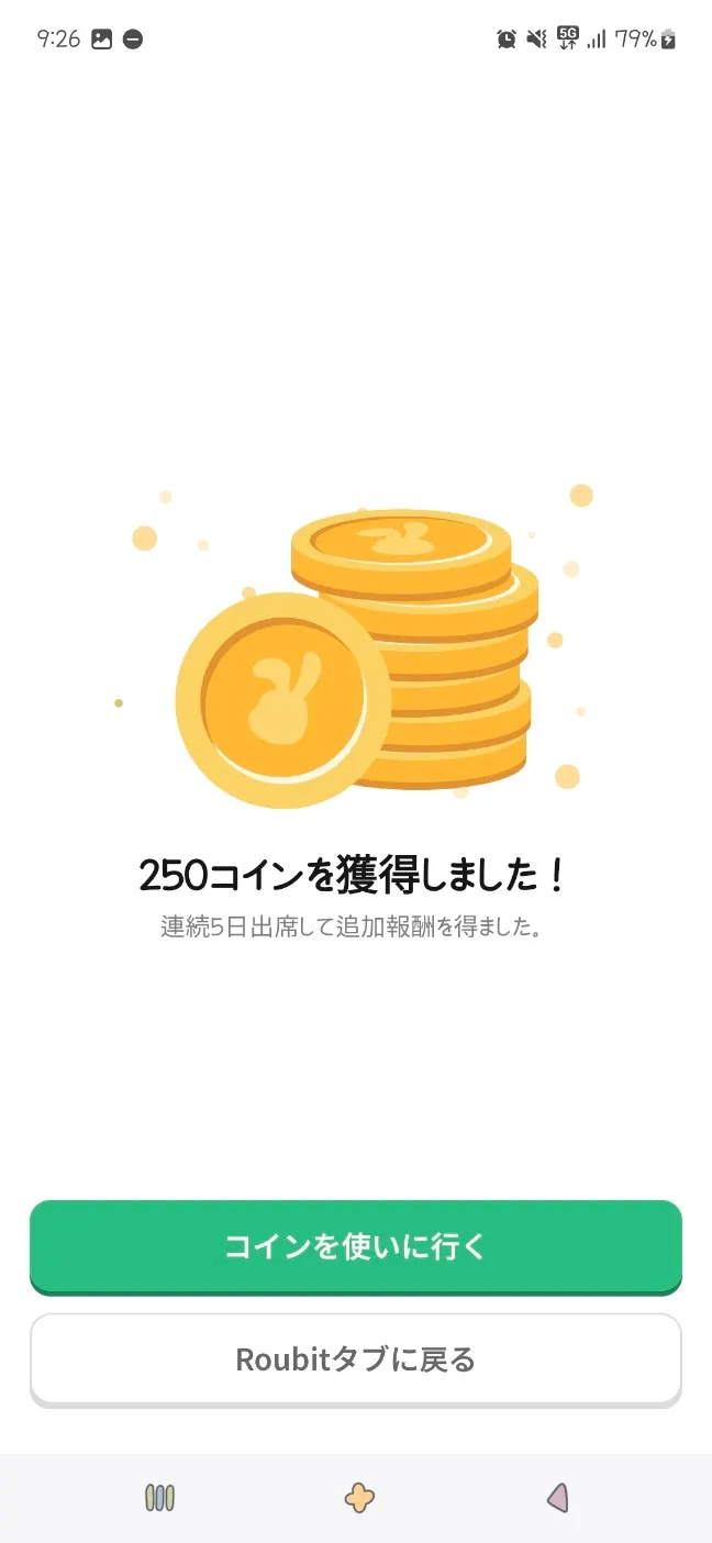 連続出席を5日ごとに達成すると、250コインとボーナスのニンジンを受け取ることができます。