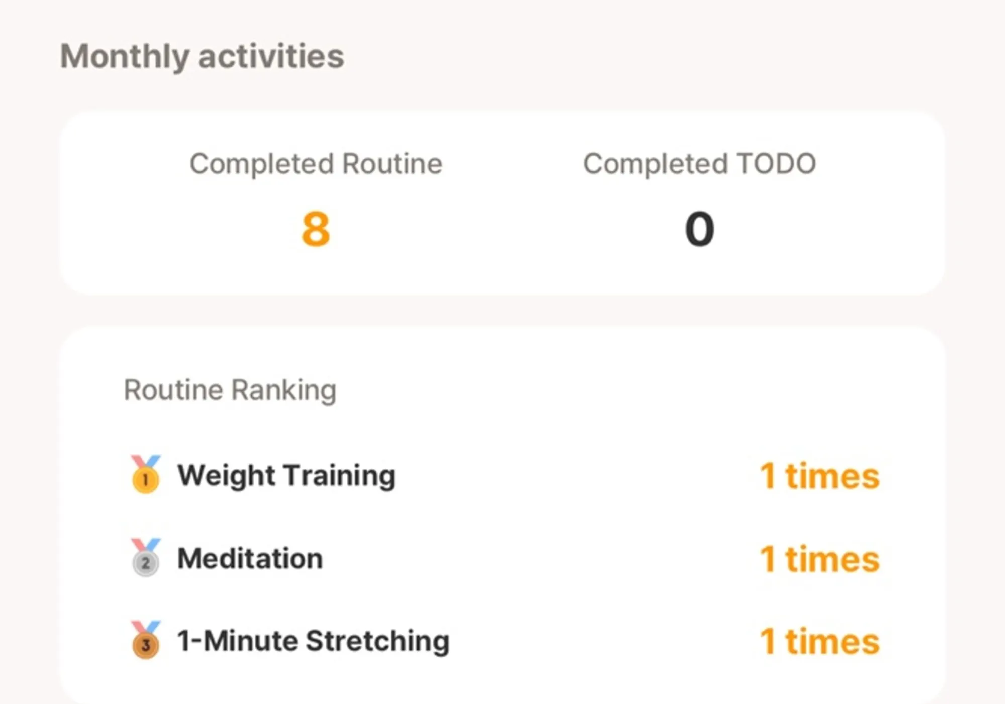 You can check the number of routines/Todos you've completed and the routine you've completed the most.