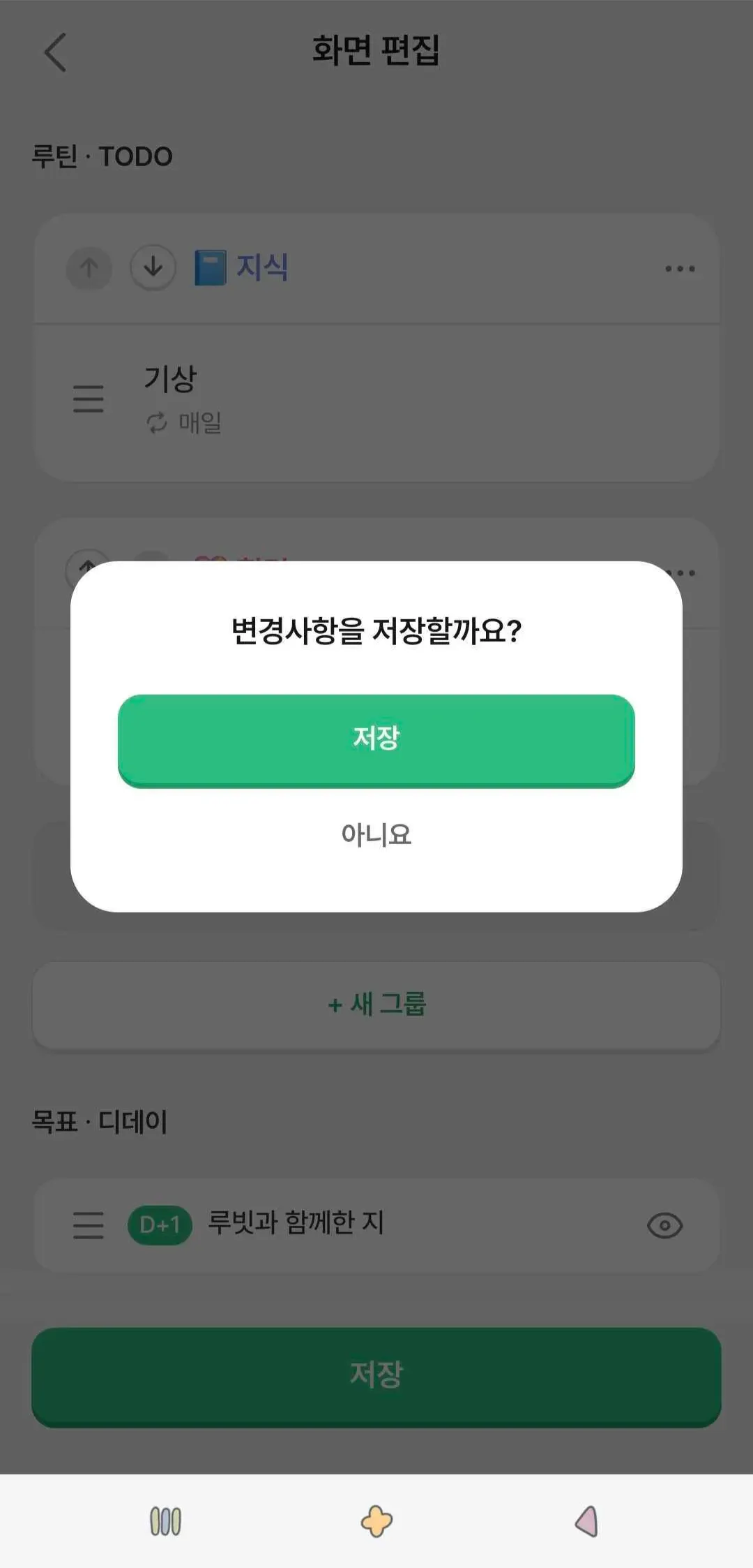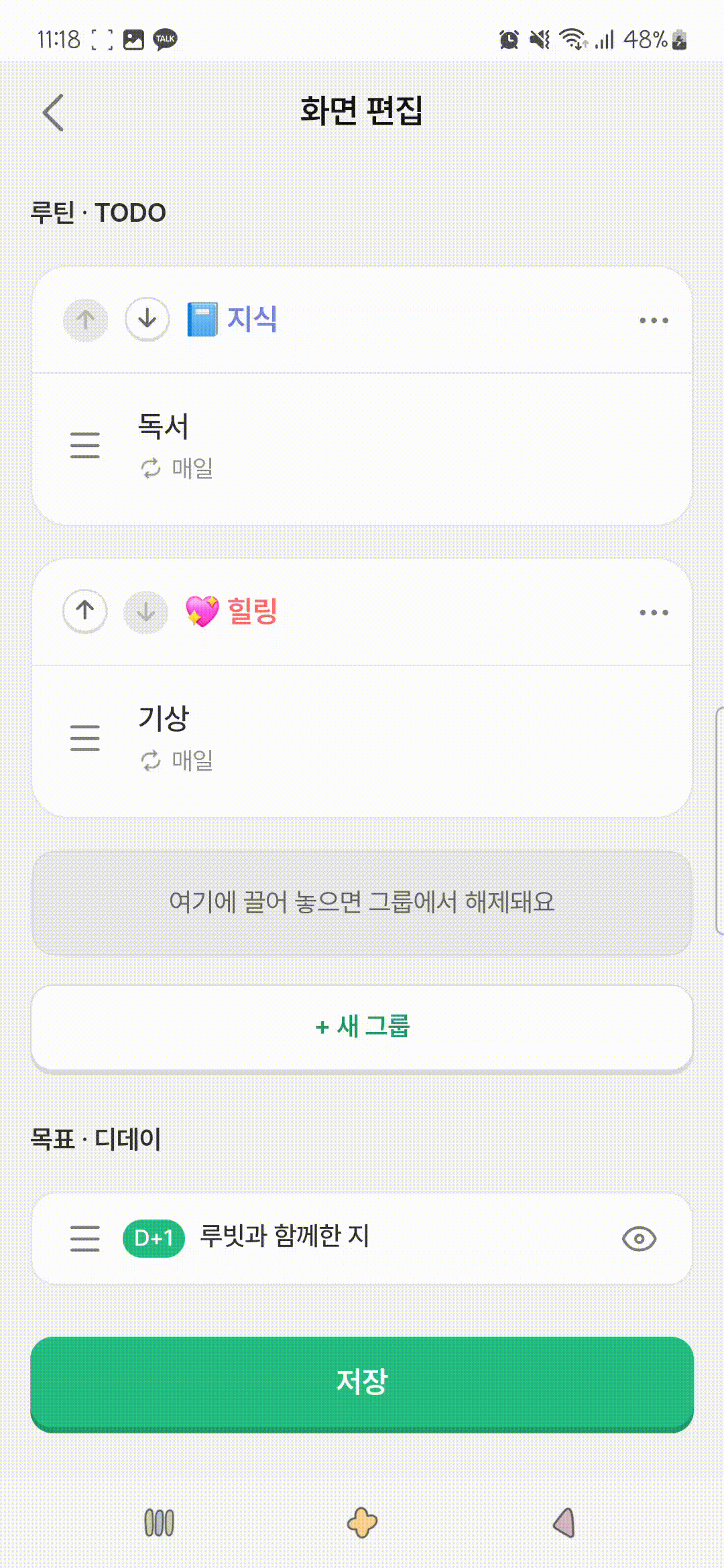 ‘화면 편집’ 메뉴에서 순서를 바꾸고 싶은 루틴을 1초간 누른 다음 드래그 방식으로 위치를 옮겨 주세요.