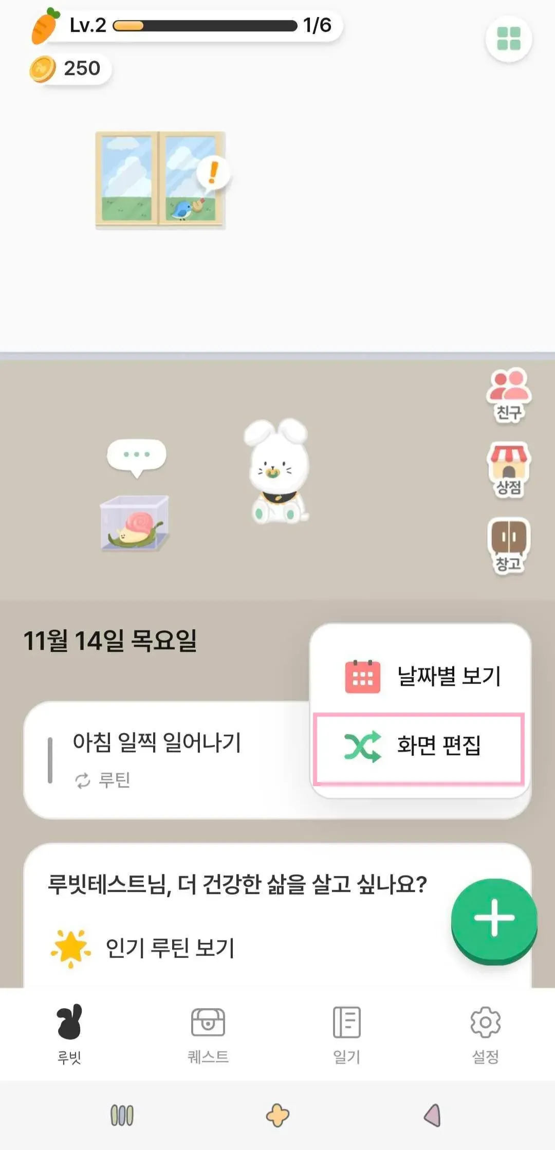 루빗 탭에서 메뉴를 눌러 ‘화면 편집’을 선택해 주세요