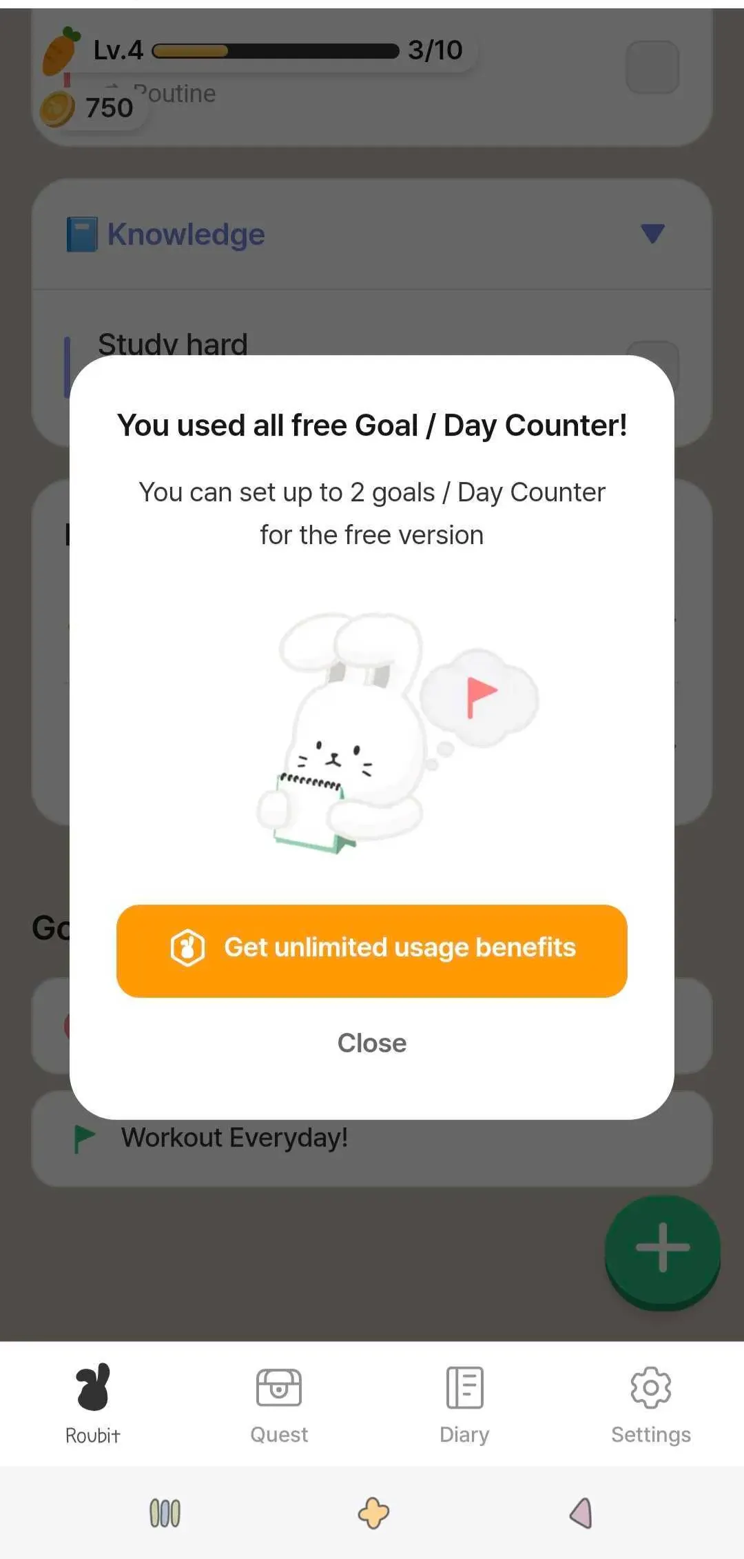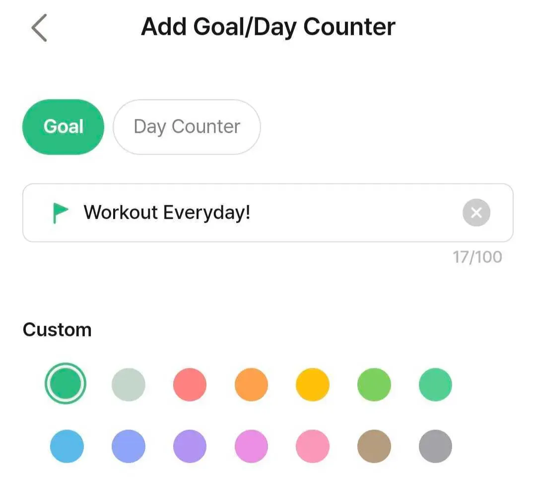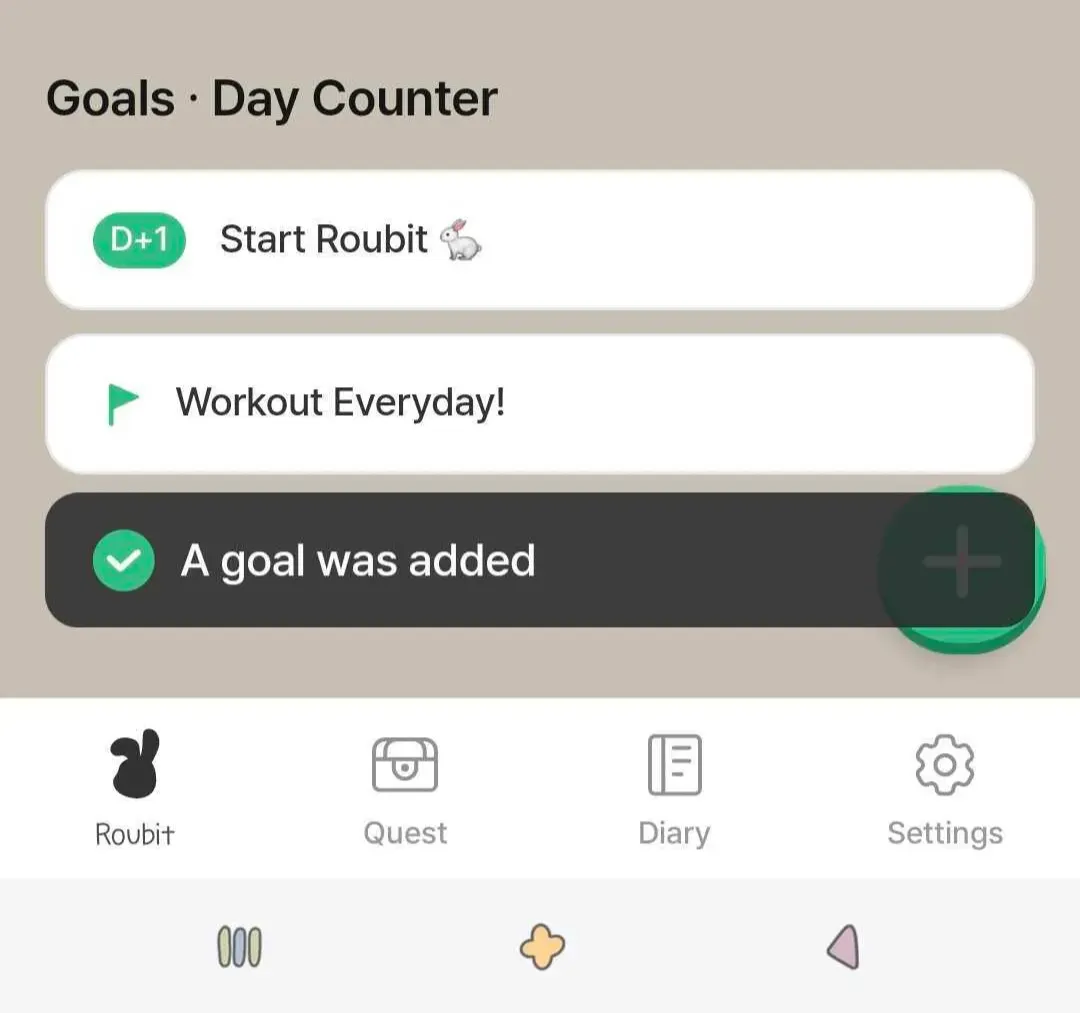 You can create new ones by pressing the + button on the Roubit tab or edit existing goal·Day Counter by tapping on them!