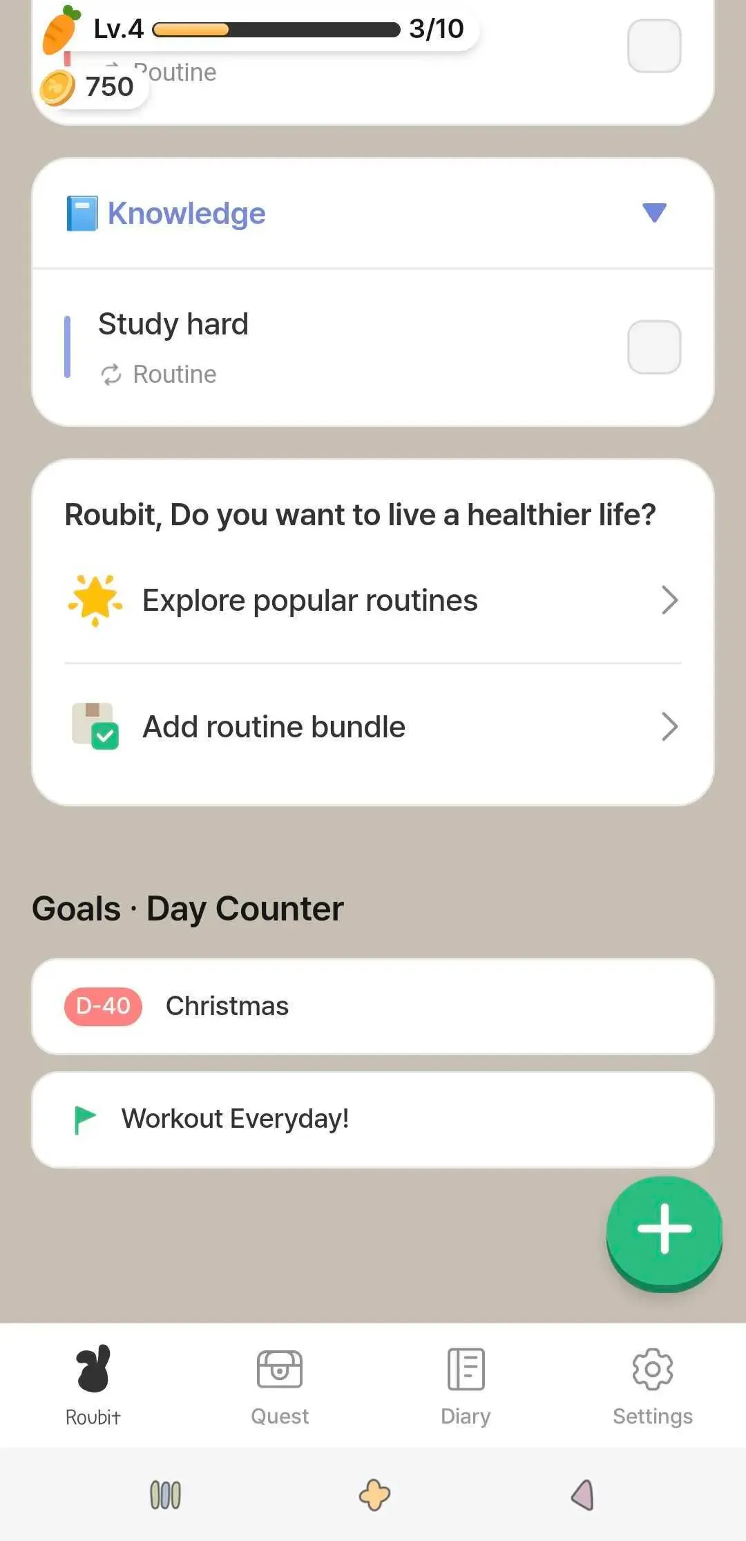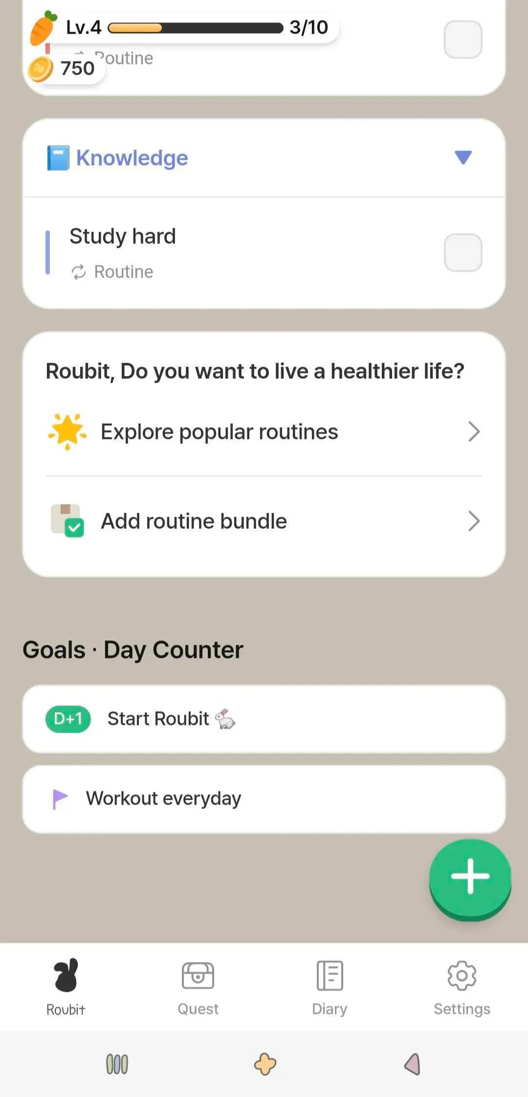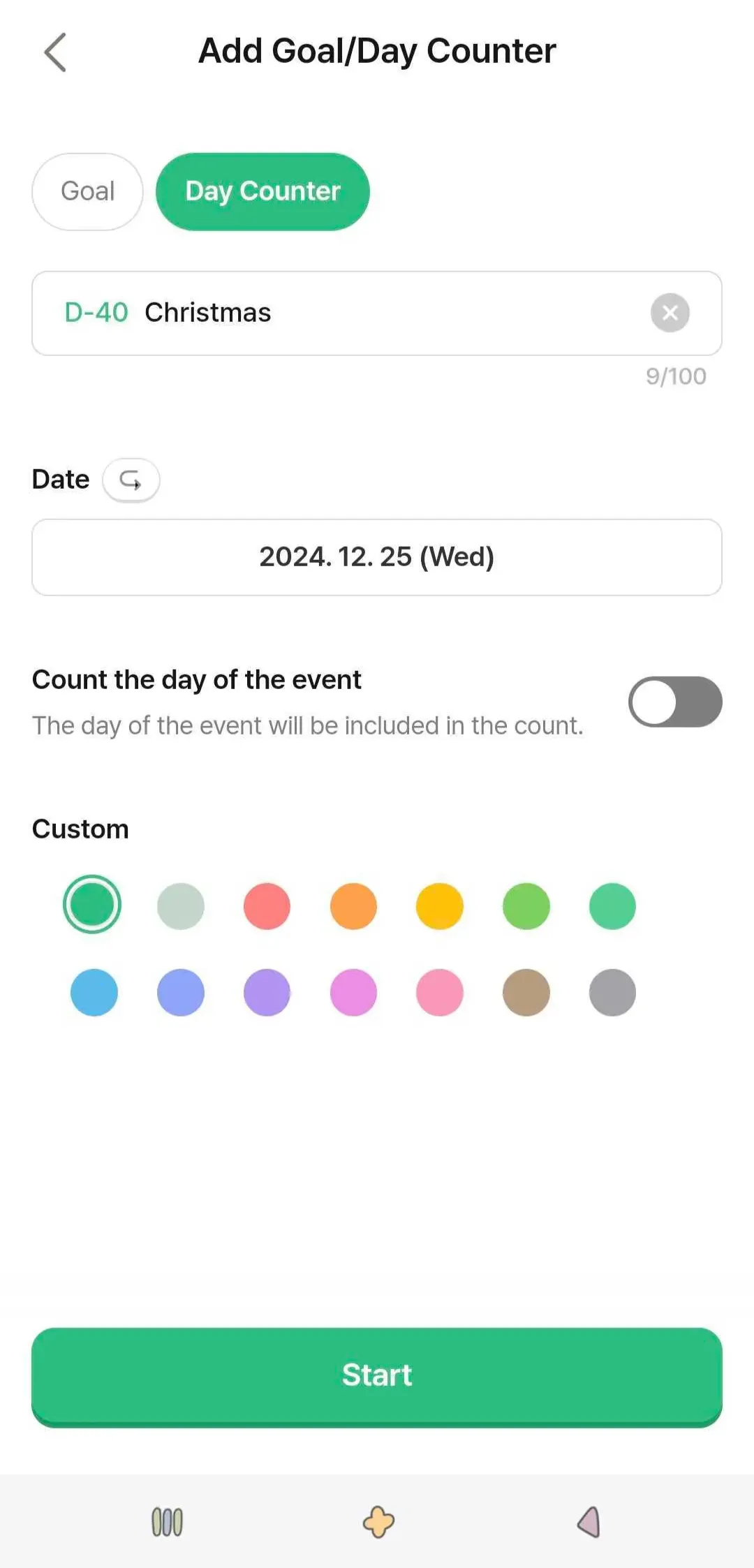 You can create new ones by pressing the + button on the Roubit tab or edit existing goal·Day Counter by tapping on them!