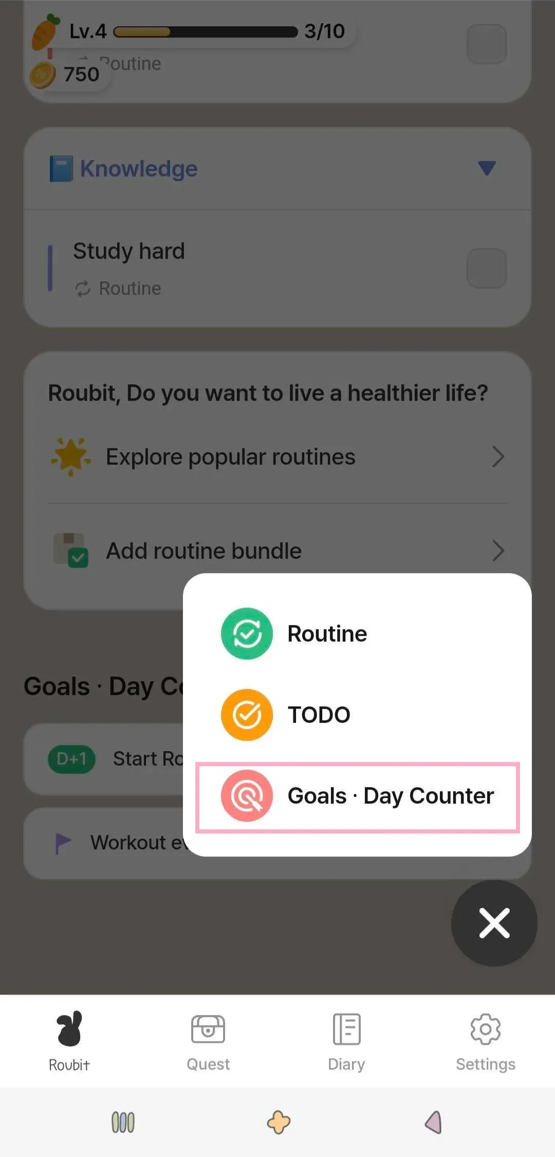 Go to the Roubit tab and press the + button at the bottom right, then select Goal·Day Counter